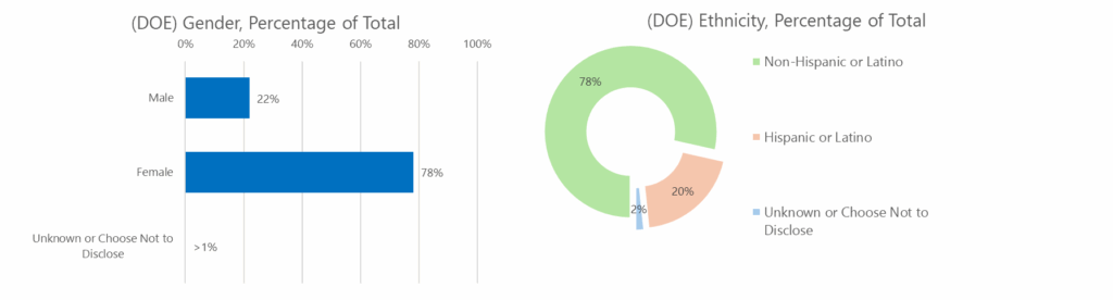 | Ethnicity | Whether the employee is Hispanic or Latino, which is self-identified by the employee. | Hispanic or Latino; Non-Hispanic or Latino; Unknown or Choose Not to Disclose |