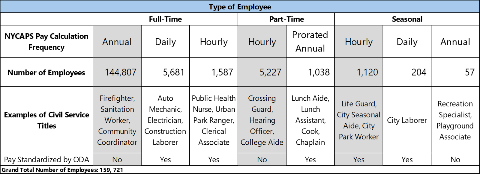 | Employee Status | Pay Calculation Frequency | Hours per Day | Days per Year | Hours per Year | Unique Titles | Number of Employees |